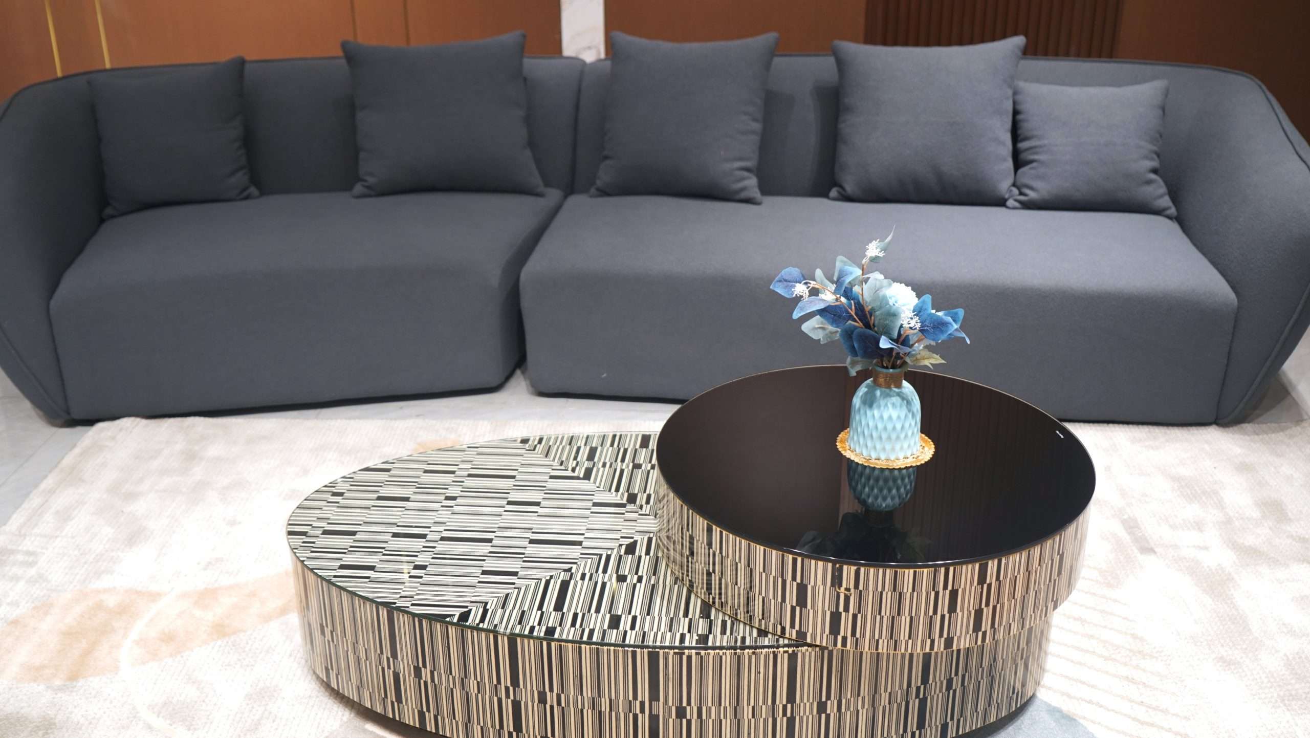 Designed with plush back cushions and coordinating throw pillows, the Oryx offers exceptional comfort while maintaining a sleek and sculptural form. Its curved corner configuration encourages connection and relaxation, making it a perfect centerpiece for both everyday living and elegant gatherings.