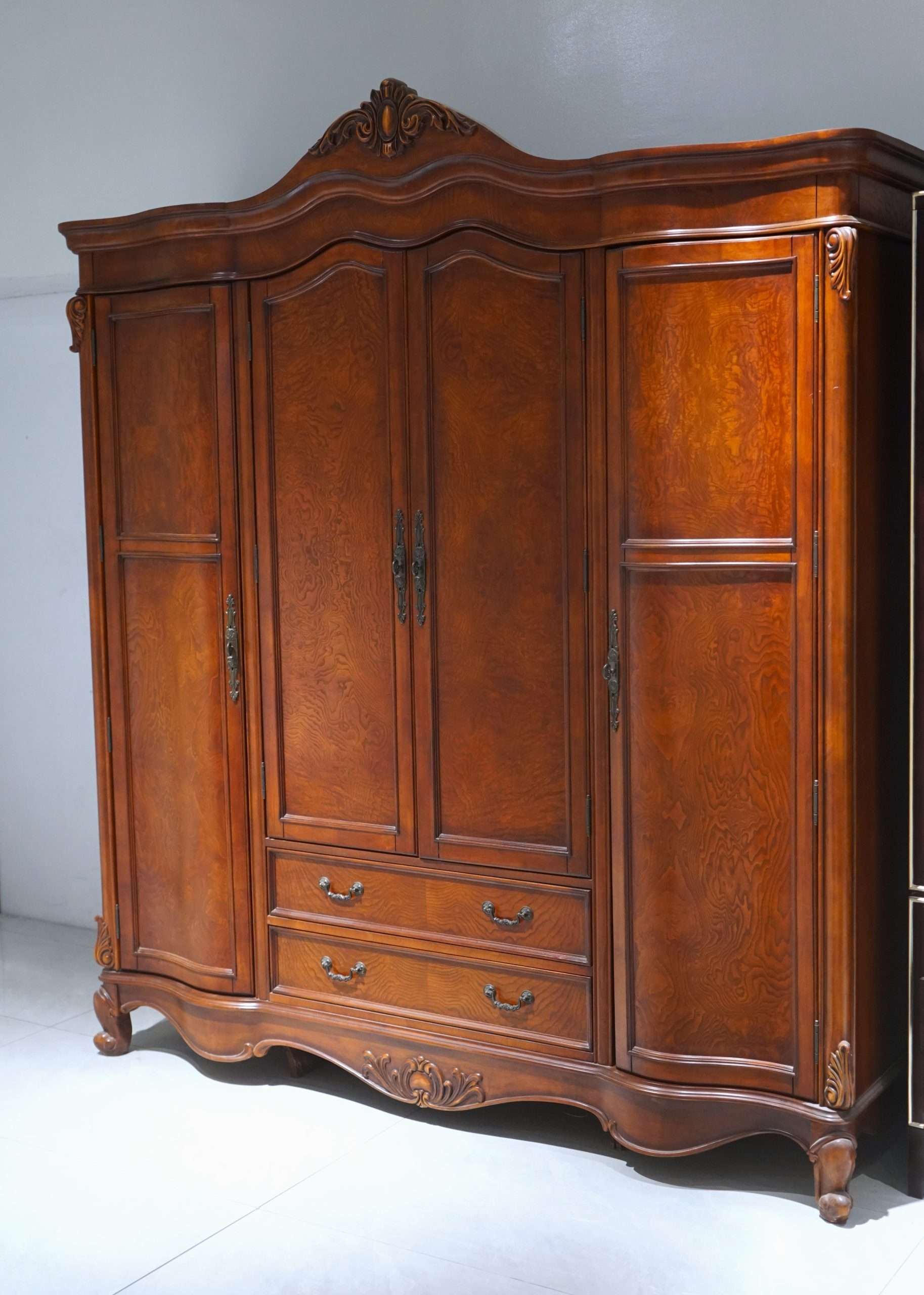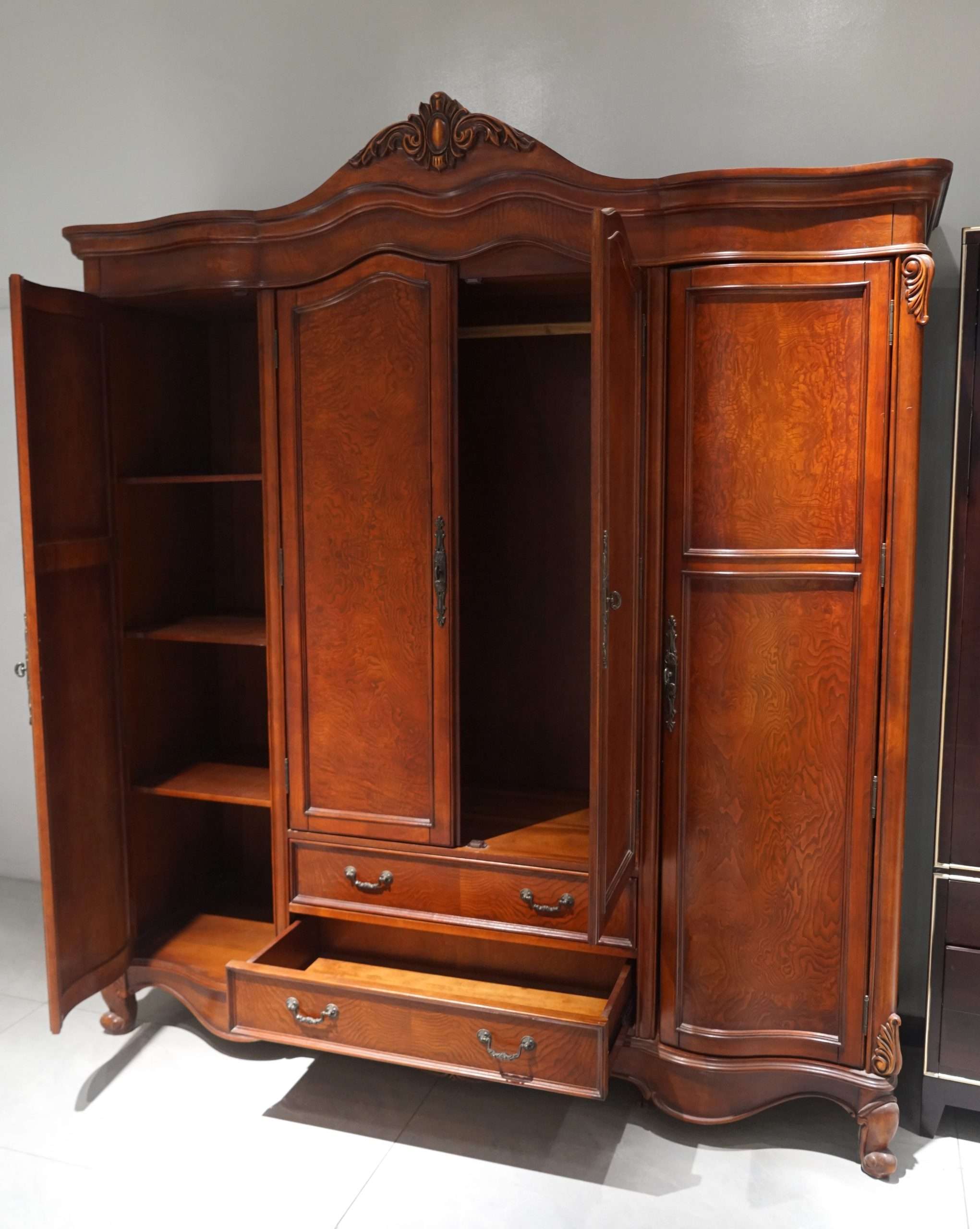 - Nicely styled in Victorian fashion, this wardrobe is suitable for the storage of clothes and other items with enough space to store clothes, shoes, documents, etc.